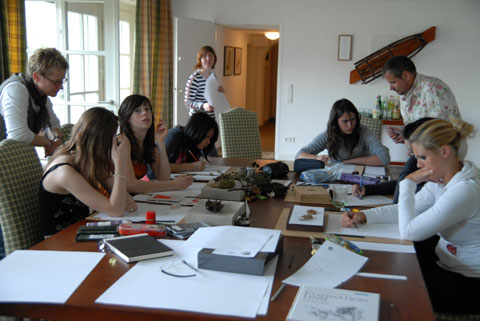 Zeichnen für Fortgeschrittene unter professioneller Anleitung von fünf DozentInnen. Zunächst wird ein Gegenstand mit traditionellem Zeichenwerkzeug handwerklich genau nach der Natur abgezeichnet. Dabei werden die Teilnehmenden durch einfühlsame Einzelkorrektur unterstützt. Der Kurs zielt darauf, sowohl gestalterische und technische Erfahrungen neu zu erwerben als auch individuelle Konzepte weiter zu entwickeln. Impulse für die künstlerische Umgestaltung bei der zeichnerisch-graphischen »Metamorphose von Objekten«. Der Wechsel von gemeinsamen Aktivitäten, konzentriertem Zeichnen, Diskussionen mit den Dozenten und Austausch in der Schülergruppe, neben genüsslichen Tafelrunden geben dem Seminar in anspruchsvollem Ambiente seinen besonderen Charakter.