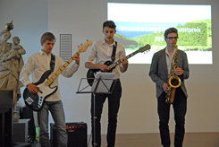 Dr. Andrea Stockhammer, Direktorin des Landesmuseum Mainz, Stifterin Ilse Lang, Bildungsstaatssekretär Hans Beckmann lauschen der PFG-Combo.